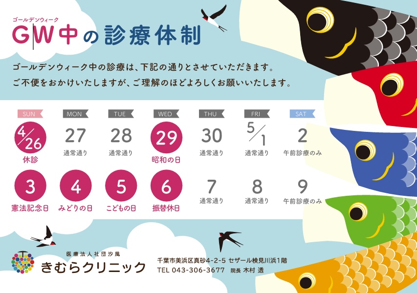 ゴールデンウィーク期間中の診療体制は以下の通りとなります。